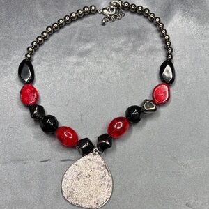 This stunning necklace features bold red and black beads, perfect for adding a touch of elegance to any outfit. The intricate design is both eye-catching and sophisticated.