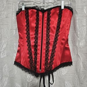 This stunning red corset features intricate black lace detailing, perfect for adding a touch of elegance to your intimate wear. It has a zipper in the front. I took top middle and bottom measurements across. However, lace-up back allows for some adjustments. EUC!