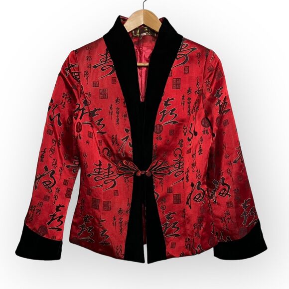 This stylish women's jacket features a vibrant red design with black accents, perfect for adding a touch of elegance to any outfit. Ideal for both casual and formal occasions. I love this and was bummed when I tried it on. The previous posher labeled it as M however this fits like a small. I would say it is for a 2-4 person with a B cup or a 32 inch bra size or smaller. The velvet is such a nice touch. Fun for holidays or Chinese New Year or simply a fun Saturday night!
