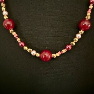 Add a touch of elegance to your outfit with this stunning red, burgundy and antique gold colored beaded necklace. Perfect for elevating any look. This is costume jewelry.