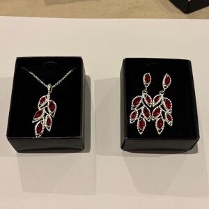 This stunning jewelry set features a beautiful red and silver design, perfect for adding a touch of elegance to any outfit. The intricate detailing and vibrant colors make it a must-have accessory. Both the necklace and earrings come in black gift boxes.