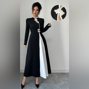 This elegant black and white dress features a sophisticated design perfect for any occasion. The contrasting colors create a striking look.