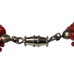 This elegant multi-strand red beaded necklace features a secure silver clasp, offering a touch of vibrant style to any ensemble.