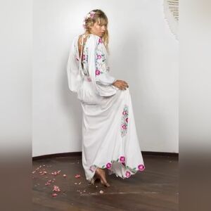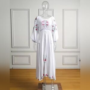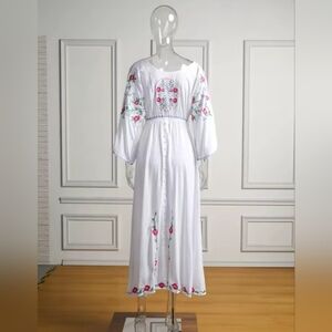 This stunning long sleeve dress features intricate floral embroidery on a flowing white fabric. Perfect for any occasion, it combines elegance with comfort. The dress is reversible.