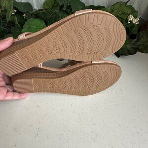 These sandals offer a sophisticated touch with their rhinestone detailing and elegant rose gold color. They provide a comfortable fit with their elastic bands and slight heel, making them suitable for various occasions or professional settings. Crafted with attention to detail, these sandals are both stylish and versatile.