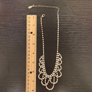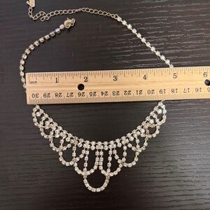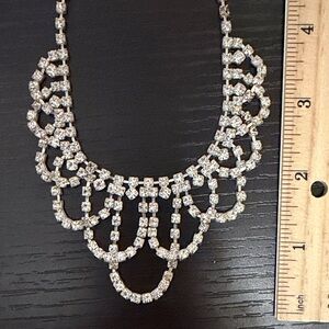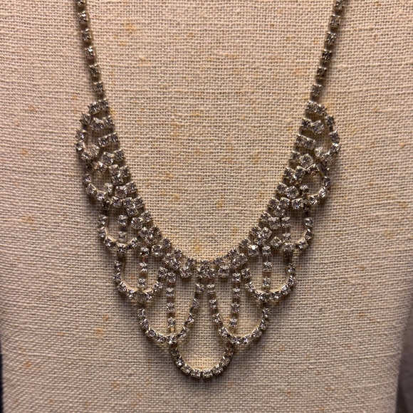 vintage-inspired bib necklace features a intricate scalloped design adorned with clear rhinestones in a silver-tone setting