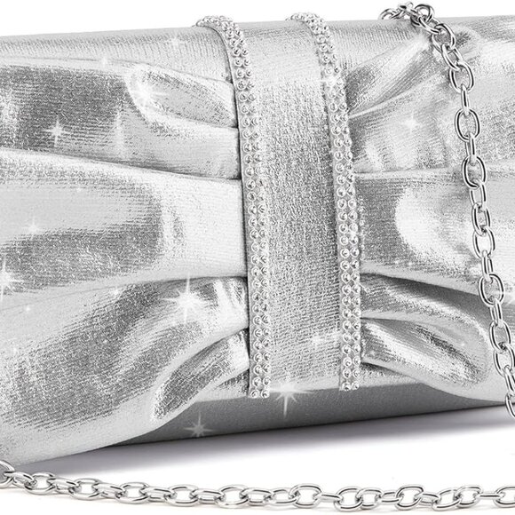 Features: Elegant satin clutch with a large bow flap decorated with tiny rhinestones. Compact yet spacious enough for your phone, lipstick, keys, and cards. Magnetic closure keeps everything secure. Includes a main compartment and an extra card slot for organization.