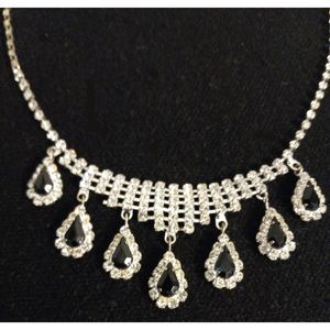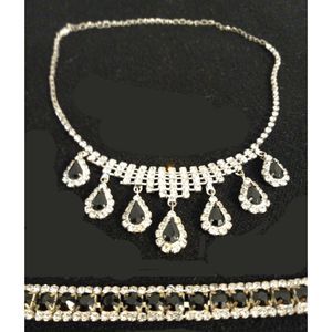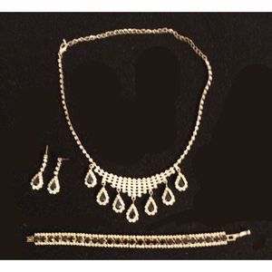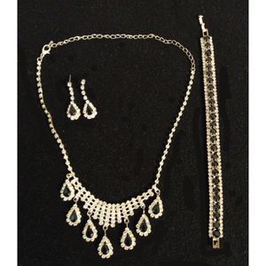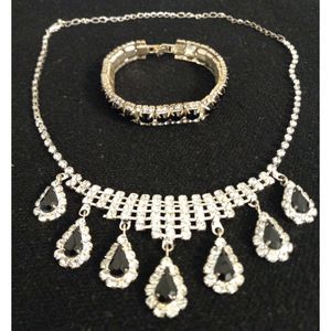 This listing is for a beautiful Elegant Romance 3 Piece Silver Tone Necklace Set with Matching Bracelet and Earing. Stylish designed metal necklace, Bracelet and earrings are designed with material that is durable. This item is in good condition. Metal color: silver with black stone. See pictures as part of description. If you have any questions, feel free to ask. Thank you.