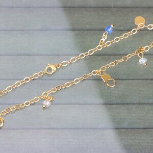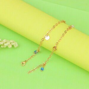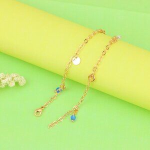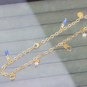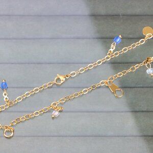 Chic and minimal rose gold anklet featuring dainty blue and white bead charms.