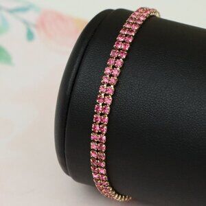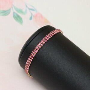 Stunning rose gold bracelet crafted with high-quality brass, beautifully adorned with sparkling pink stones for a vibrant, glamorous look. Perfect for adding a pop of color to any outfit.