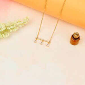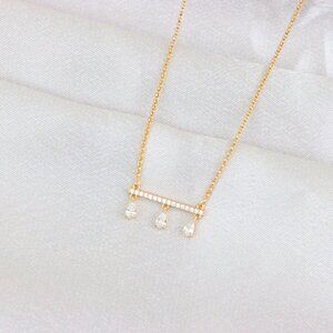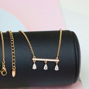 A sophisticated rose gold necklace featuring a sparkling bar with three teardrop-shaped charms, perfect for adding a refined touch to any outfit.