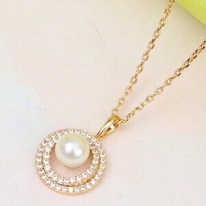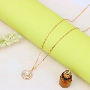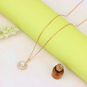 ✔ Features a round pearl encased in a sparkling double halo pendant