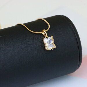 A dainty and luxurious pendant featuring a radiant rectangular crystal set in a beautifully ornate rose gold frame. A perfect piece for a refined, minimal yet striking look.