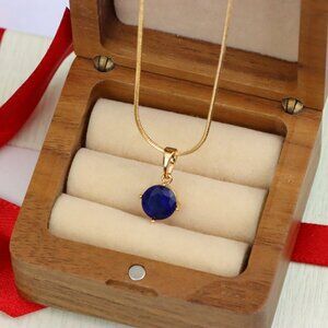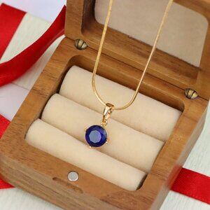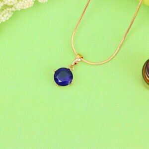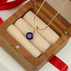 This classic round pendant features a deep blue stone set in a rose gold-plated frame, offering a touch of sophistication and charm. Its compact size makes it perfect for daily wear or layering with other pieces.