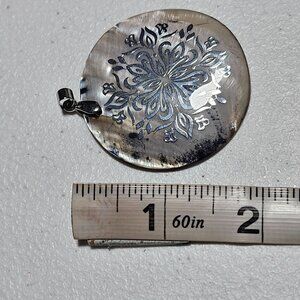 This round pendant, crafted from lustrous mother of pearl, features an intricate floral design. The metal bail adds a touch of elegance, making it suitable for various styles. Lightweight and easy to wear, it's a unique accessory that complements multiple outfits.