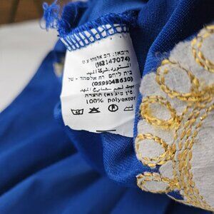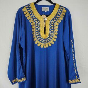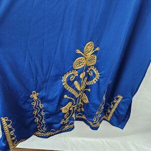 This stunning kaftan dress, sized 3XL, features intricate gold embroidery that highlights its royal blue fabric. A blend of 100% polyester, ensures a comfortable and durable wear. The ornate neckline and detailed sleeve patterns make this piece ideal for special gatherings or cultural events.