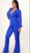 Chic royal jumpsuit with sheer long sleeves. Features a deep V-neckline and stylish draped design.