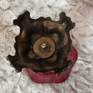 Elegant Ruby Glass Compote with Ornate Metal Stand. Vintage