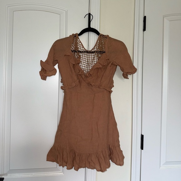 Step out in style with this elegant rust colored ruffle dress. Perfect for any occasion, this dress features a flattering silhouette, ruffle details, and a mesh detail in the front.