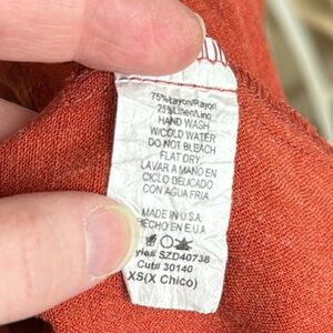 Sozy linen blend midi dress. American made! 🇺🇸 The V neck is a little too deep for my comfort zone and the bust area is too baggy for me (I’m a 34AA for reference. Can’t get much smaller than that! 😩) Purchased brand new and never wore it (other than to try on). Washed once and line dried. I held onto it for a year, thinking I would get it altered, but I’d rather sell it.