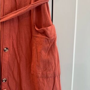 This elegant rust midi dress features a flattering V-neck and faux button-down front. Perfect for any occasion, it offers a comfortable fit with its soft fabric and stylish belt. Add a touch of sophistication to your wardrobe with this versatile piece. Perfect Condition