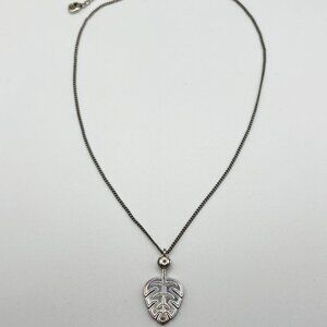 Sophisticated botanical-inspired necklace featuring an intricately designed silver leaf pendant adorned with delicate crystal embellishments and a vibrant emerald green crystal accent. Versatile accessory that combines nature-inspired design with refined metalwork.