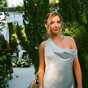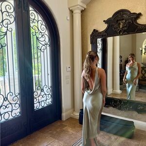Turn heads with this stunning sage backless dress. Perfect for evening events, its elegant design and shimmering color make it a standout piece. (Back chain is not included) - can fit a small/medium