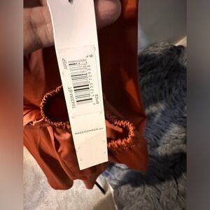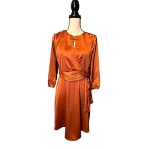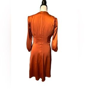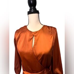 This elegant satin dress in a rich orange hue is perfect for any occasion. Its sleek design offers a sophisticated look.