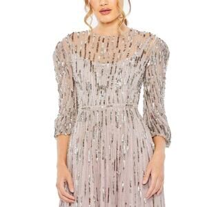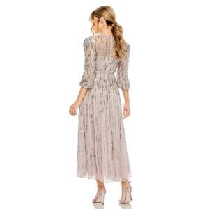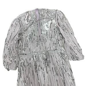 Shimmer in this elegant sequin embellished dress. Perfect for special occasions, this dress features a stunning silver hue that catches the light beautifully.