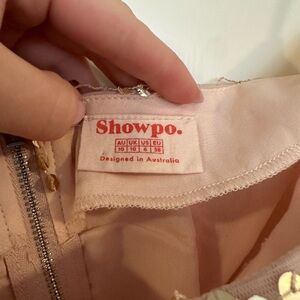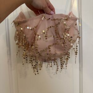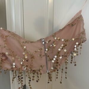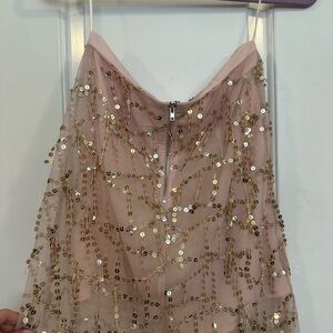 Chic mini skirt and top with pink base. Gold sequins add sparkle. Ideal for parties. (Group 5)