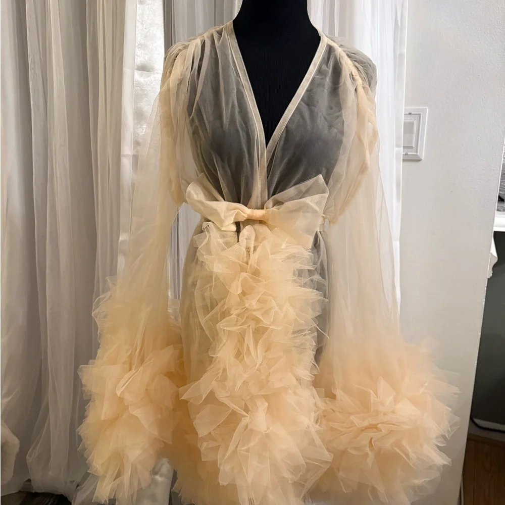 Luxurious sheer short robe with dramatic ruffle details. Perfect for adding elegance to any occasion. Never worn. Comes from smoke free pet free home. No returns ask all questions before purchase