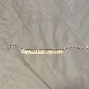 This elegant shell necklace features a beautiful array of cream and gold tones, perfect for adding a touch of sophistication to any outfit.