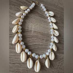 This elegant necklace features beautiful cream-colored shells and lustrous white pearls, perfect for adding a touch of sophistication to any outfit.