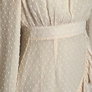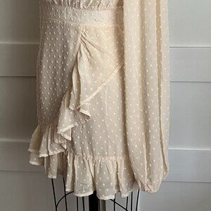 Elegant, Showpo Cream Chiffon Mini Cocktail Dress, Long Sleeve, Mock Neck, Fitted Waist, Ruffle Asymmetrical Skirt, Shoulder Detail, Nipped Waist, Worn Only Once, Like New, Size 2. Bust 33/34 Waist 25 Hip 36