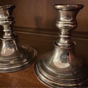 These silver candle holders boast a classic design with a wide, tiered base and a gracefully curved stem. The polished surface enhances their reflective quality, making them a striking accent in any room. Perfect for adding a touch of sophistication to your decor.