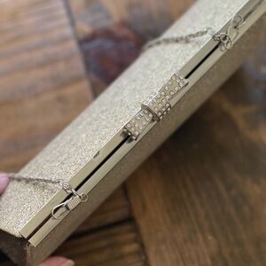 Stylish silver clutch with a shimmering finish. Features a delicate chain strap for easy carrying.