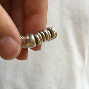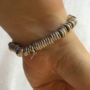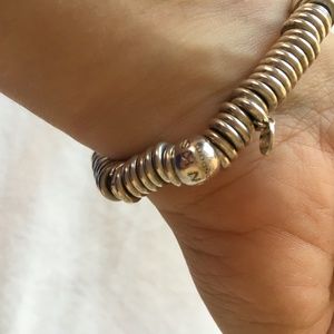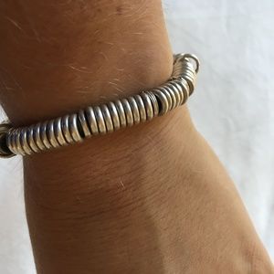 This elegant silver coil bracelet adds a touch of sophistication to any outfit. Perfect for any occasion.