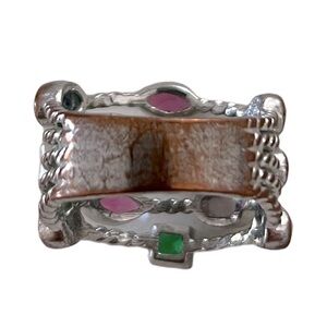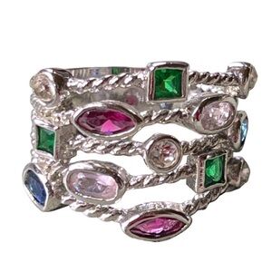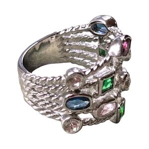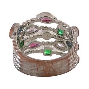 This stunning silver toned ring features vibrant gemstones in pink, green, and blue, creating a colorful and elegant look. Perfect for adding a touch of sophistication to any outfit.