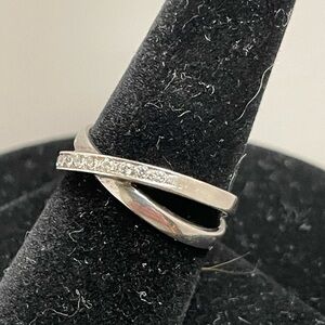 This elegant silver crossover ring adds a touch of sophistication to any outfit. Silver tone with sparkling cubic zirconia. Perfect for any occasion. Size 9. Stamped MHMP. Good preowned condition.
