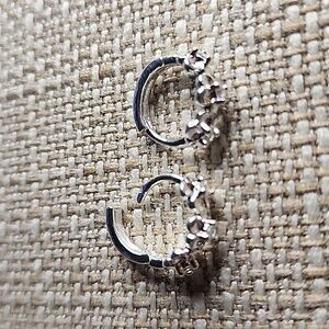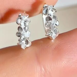 These elegant silver floral hoop earrings add a touch of sophistication to any outfit. Perfect for any occasion.