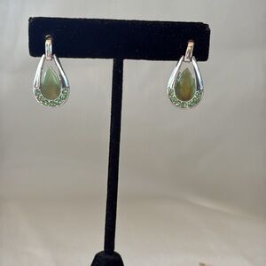 An elegant vintage jewelry set features a stunning combination of silver, faceted green teardrop cats eye and simulated Peridot green stone accents. Pierced post earrings. Perfect for adding a touch of sophistication to any outfit. Great vintage condition with minimal wear. The pendant’s stone has a tiny black speck inside the stone.