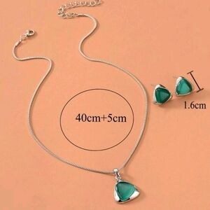 Elegant Silver & Green Stone Jewelry Set – Necklace & Earrings Stylish Triangle Green Gemstone Jewelry Set – Perfect Gift Chic Silver & Green Jewelry Set – Timeless & Elegant Luxury Green Stone Pendant & Earrings – Fashion Statement Trendy Silver-Plated Triangle Jewelry Set – Classy & Unique Description Options: Elevate your style with this stunning silver-plated jewelry set featuring a triangular green gemstone design. Includes a necklace with a matching pendant and elegant stud earrings. Perfect for special occasions, gifts, or everyday elegance. This elegant jewelry set features a silver-tone finish and a beautiful green stone, adding a touch of sophistication to any outfit. Ideal for weddings, parties, and casual wear. A modern and stylish triangle-shaped green gemstone jewelry set, crafted with a sleek silver-tone finish. Lightweight, comfortable, and perfect for any occasion.