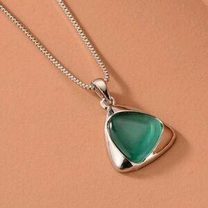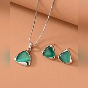 Green gemstone jewelry, silver-plated necklace, triangle earrings, elegant jewelry set, trendy accessories, stylish fashion jewelry, luxury pendant, women's