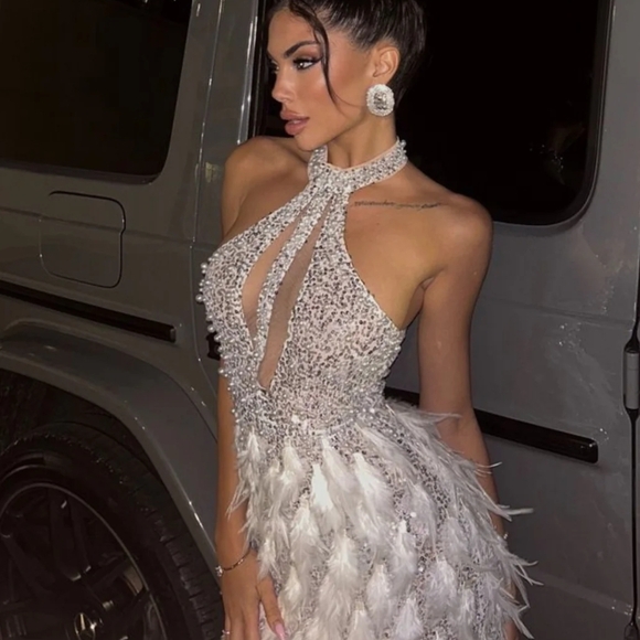 Shine in this elegant silver halter dress, perfect for any special occasion. The intricate detailing and feather accents add a touch of glamour.