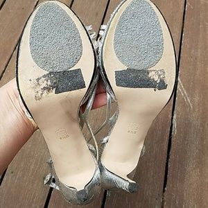 Bright shiny silver with a snakeskin look. Worn a couple times for formal indoor events. Very pretty and sexy. Adjustable strap. 4" heel with a 1/4" platform. Very good used condition just a couple of spots that have a little mark/stain on them. See pics 6,7. Feel free to ask questions! Make an offer. $35