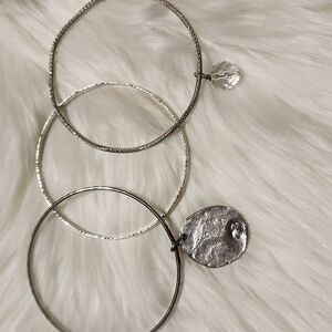 This elegant bracelet set features a stunning silver initial T pendant disk and other bracelet has a clear bead accent. The set of 3 has a silver coating. Perfect for adding a personal touch to any outfit. The sleek design and shimmering silver color make it a versatile accessory for any occasion. Boutique style with a vintage look.