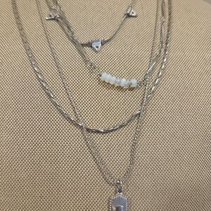This elegant silver layered necklace set is perfect for adding a touch of sophistication to any outfit. The sleek design and silver color make it a versatile accessory for any occasion.