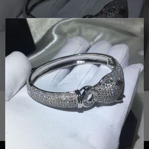 Stunning Silver bangle with a striking leopard design. Features sparkling 400 micro pave cubic zirconia’s for added glamour.