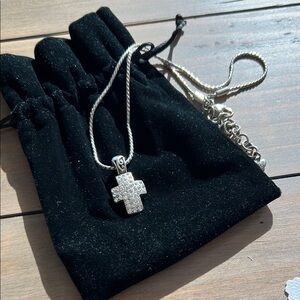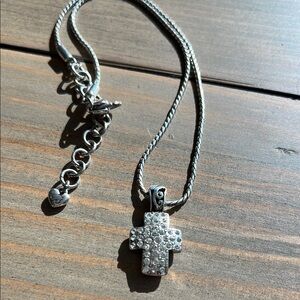 This elegant silver necklace showcases a beautifully crafted cross pendant that hangs from a delicate thin chain. The light-colored metal enhances its sophisticated appeal, making it an ideal accessory for both casual and formal occasions. By Brighton. Reversible.