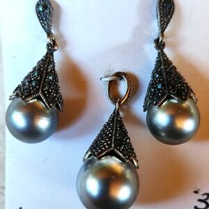 This exquisite jewelry set features a pair of earrings and a pendant, each adorned with lustrous silver pearls. The intricate design adds a touch of elegance, making it perfect for any occasion.